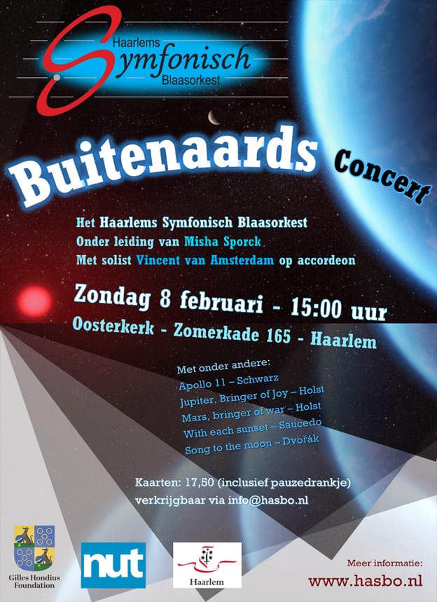 8 febr.: Winterconcert van het Haarlems Symfonisch Blaasorkest, m.m.v. Vincent van Amsterdam (accordeon), winnaar van de Nederlandse Muziekprijs 2025. Thema: 'Buitenaards' o.a.: Apollo 11; Mars, Jupiter van Gustav Holst; Concert in G-moll voor accordeon en orkest van B. Molique, en hommage aan Piazolla. Harptalent uit oa het NoordHollands Jeugdorkest Ela Yalcin soleert in Song to the Moon (Dvorak) 15.00 u. Oosterkerk - Zomerkade 165, Haarlem